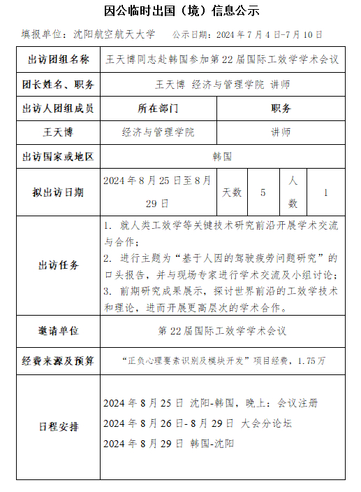应第22届国际工效学学术会议的邀请,beat365拟派王天博同志于2024年8月25日至8月29日赴韩国参加第22届国际工效学学术会议。按照省外办有关最新管理规定,现就此计划予以公示。公示日期:2024年7月4日-7月10日。如有异议,可在公示期内与外事处联系,电话:024-89724878,邮箱:foreignaffairs@sau.edu.cn。
