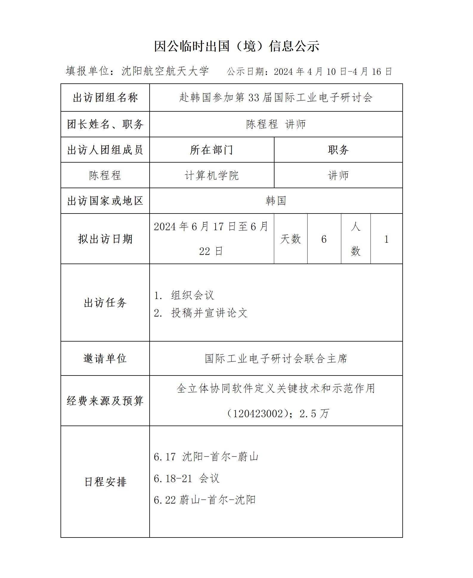 应国际工业电子研讨会联合主席赵康贤的邀请,beat365拟组派陈程程同志于2024年6月17日至6月22日赴韩国作为特邀会议组织者参加2024年第33届国际工业电子研讨会,并做会议报告。按照省外办有关最新管理规定,现就此计划予以公示。公示日期:2024年4月10日-4月16日。如有异议,可在公示期内与外事处联系,电话:024-89724878,邮箱: foreignaffairs@sau.edu.cn 。