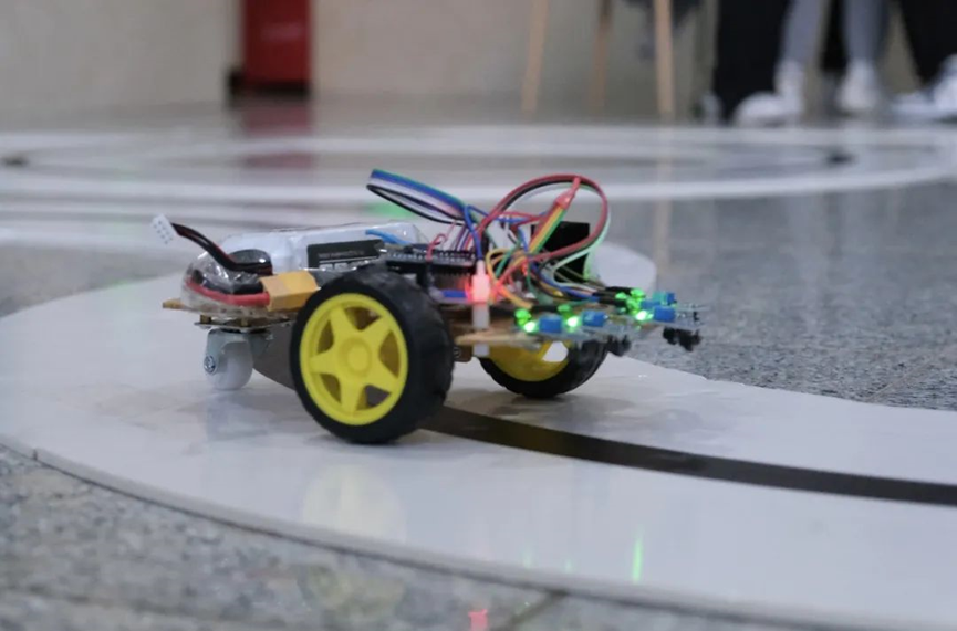 在比赛期间,每组有两次的比赛机会,在此期间可以多次调试。正式比赛开始,跑道上,各队的循迹小车各显本领,同学们都高度专注,灵活操作小车,比赛火热进行。