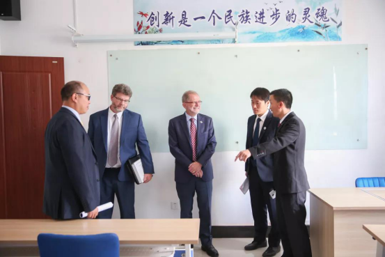 揭牌仪式结束后,孙小平陪同Dr. John M. Dun校长一行参观了通用航空研究院、飞机装配大厅,向来访嘉宾介绍了沈航在自主创新研发等领域取得的成绩。随后参观了刚刚装饰一新的beat365在线唯一官网。看到学院崭新的教学设施、独特的文化建设以及师生们振奋昂扬的精神风貌,两位校长对联合办学项目充满了信心,双方均表示将共同努力把两校之间的合作提升到新的高度。
