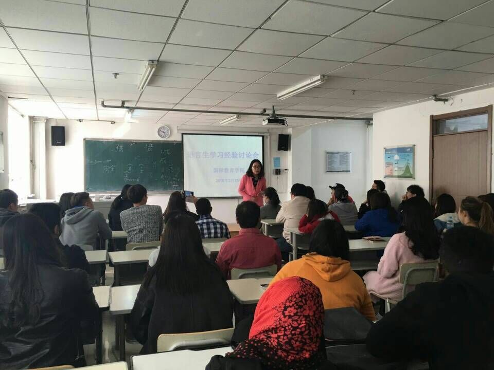 汉语教师张雪英老师在会上针对不同课程的性质向学生介绍综合、口语及听力的学习方法,为本次会议拉开帷幕。来自韩国、孟加拉、布隆迪的三位留学生金秀真、沙若克、安东尼结合自身的情况,与同学们交流自己的学习经验,同时分享自己学习汉语的技巧,比如:生词记忆卡、汉字音义联想法等,引起了学生们的兴趣。最后,汉语教研室主任尹大伟老师以汉语的重要性为切入点,鼓励学生多听、多说、多读、多写,为本次会议画上了圆满的句号。