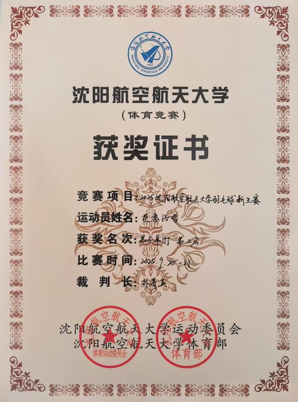 在羽毛球比赛中,beat365男子单人比赛项目也取得了佳绩,飞制 2512 范孝浩哲获亚军、自动化 2511 杜帅锟获8强佳绩、飞动 2513 杨天石获16 强佳绩。