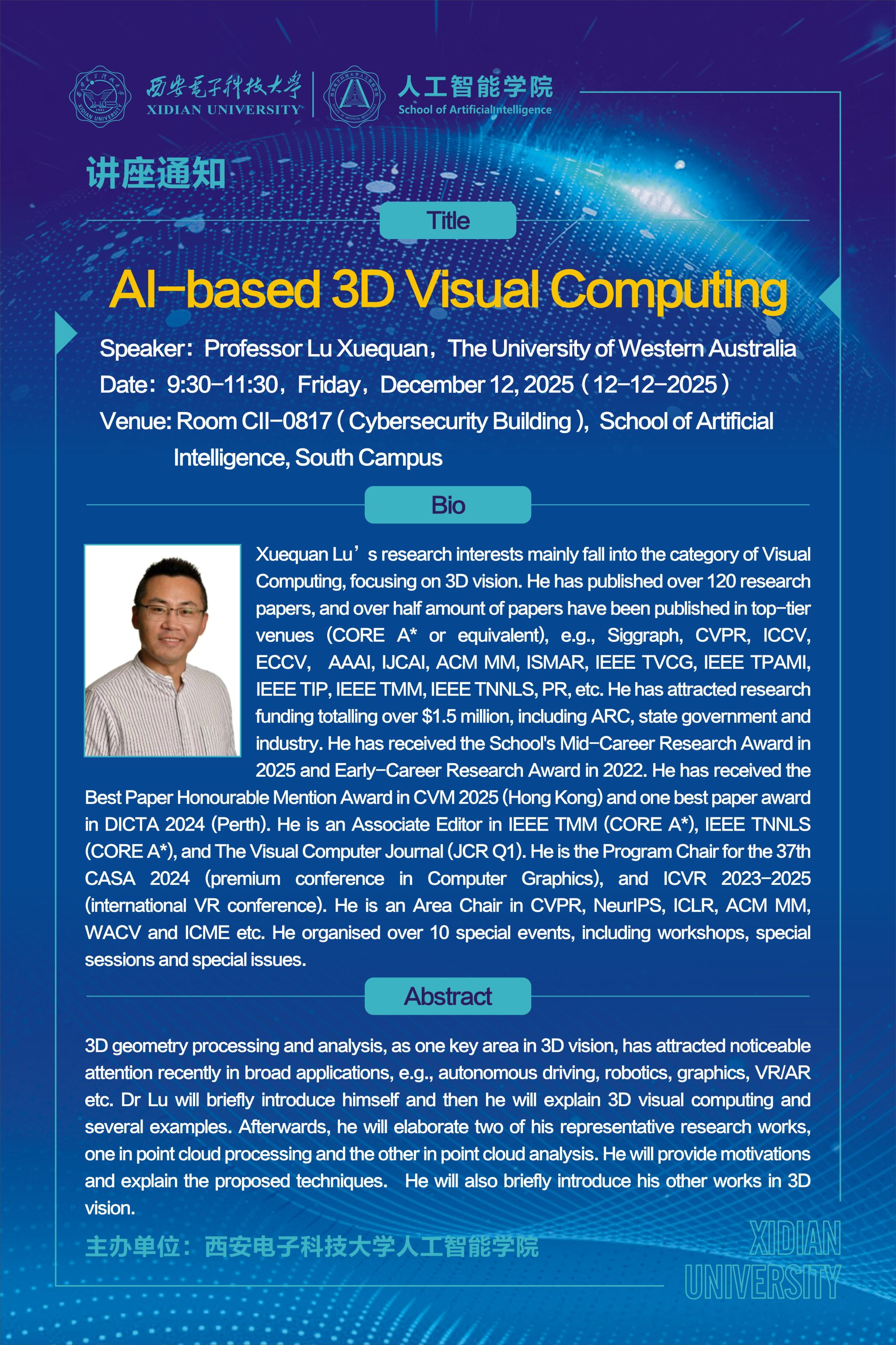 为拓宽学术视野,促进学术交流,学院有幸邀请到鲁学权 教授(澳大利亚 西澳大学)于12月12日(周五)9:30,在南校区万象城awcsport官网网安大楼CII-0817为我们带来《AI-based 3D Visual Computing》的精彩学术报告,欢迎大家前来聆听、交流!