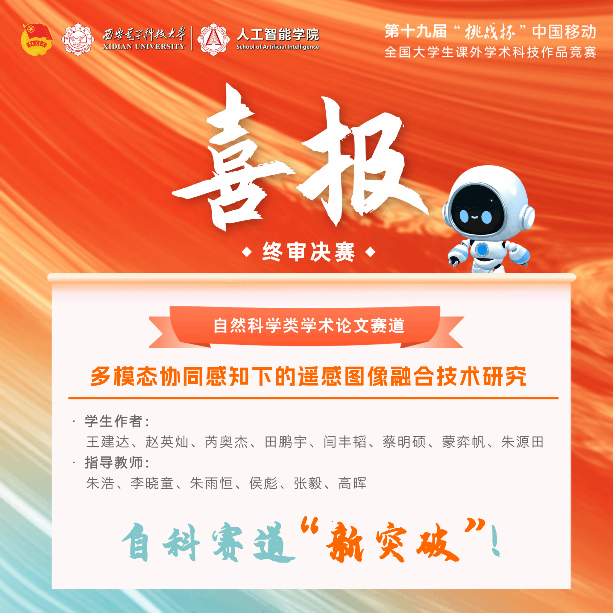 (通讯员:朱雨恒、李 雯、胡锦国) 11月3日,第十九届“挑战杯”全国大学生课外学术科技作品竞赛终审决赛在南京大学落下帷幕。万象城学子积极备赛、奋发进取,项目《多模态协同感知下的遥感图像融合技术研究》获自然科学类学术论文赛道全国三等奖。同时,该项目在省赛中荣获特等奖。这是我校在赛事主体赛“自然科学类学术论文赛道”中首次获得国家级奖项和省级特等奖,取得了在该赛道中的“新突破”!