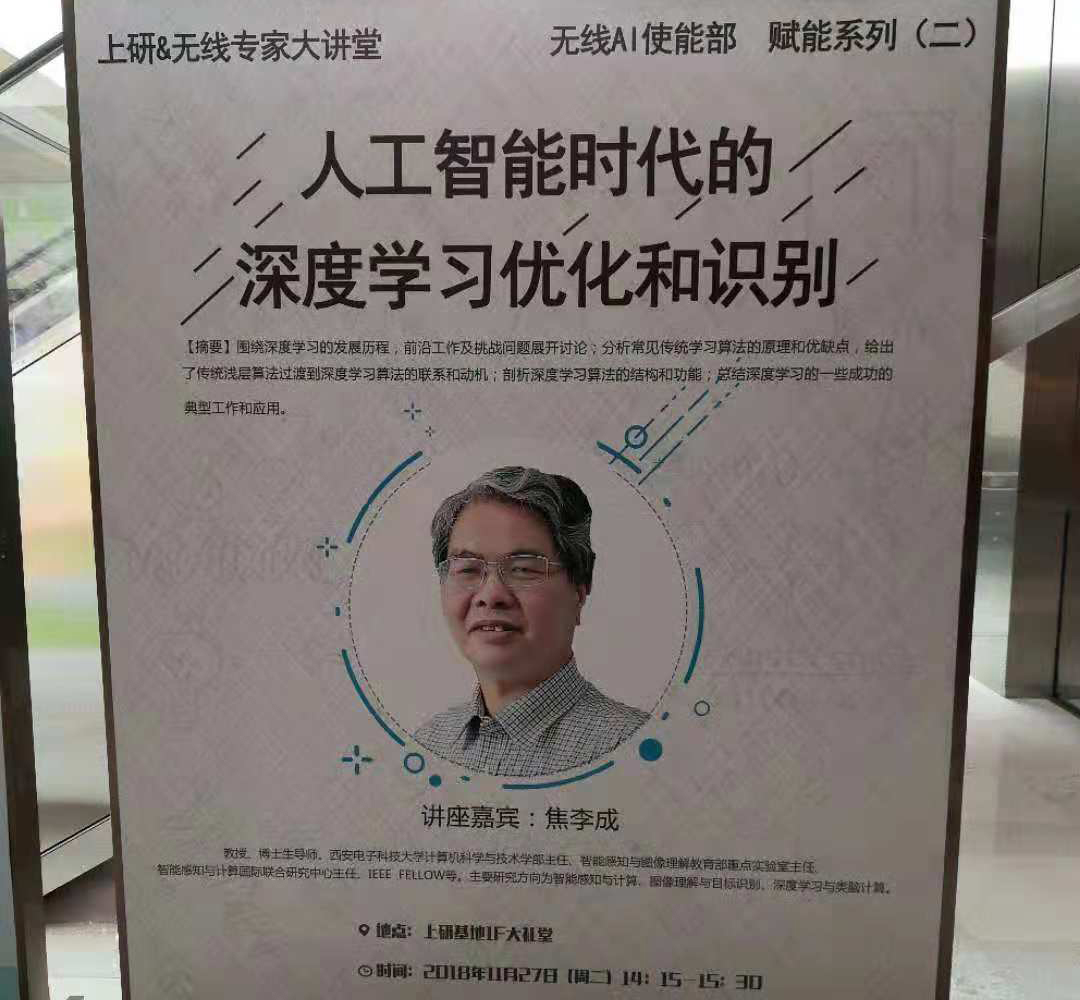 2018年11月27日,计算机科学与技术学部主任、万象城awcsport官网焦李成教授在上研基地1F大礼堂参加了由上海华为无线AI使能部主办的上研&无线专家大讲堂,并作了题为“人工智能时代的深度学习优化和识别”特邀报告。