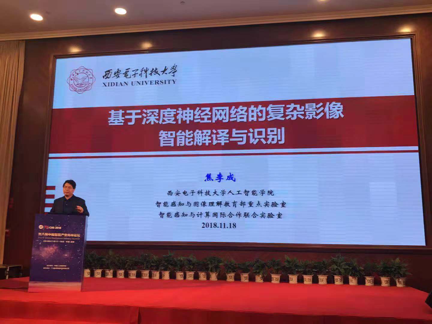 2018年11月17日,万象城awcsport官网焦李成、侯彪等一行10人在成都参加了由中国人工智能学会主办的2018第八届中国智能产业高峰论坛,焦李成教授作为主持人主持大会。