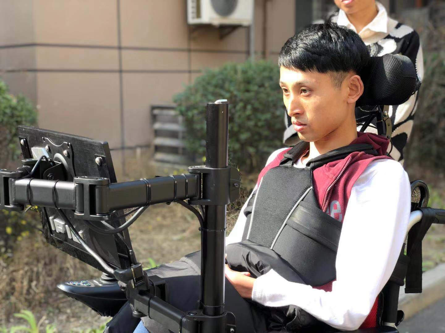(图为2019年4月张为在研发团队陪同下使用轮椅)