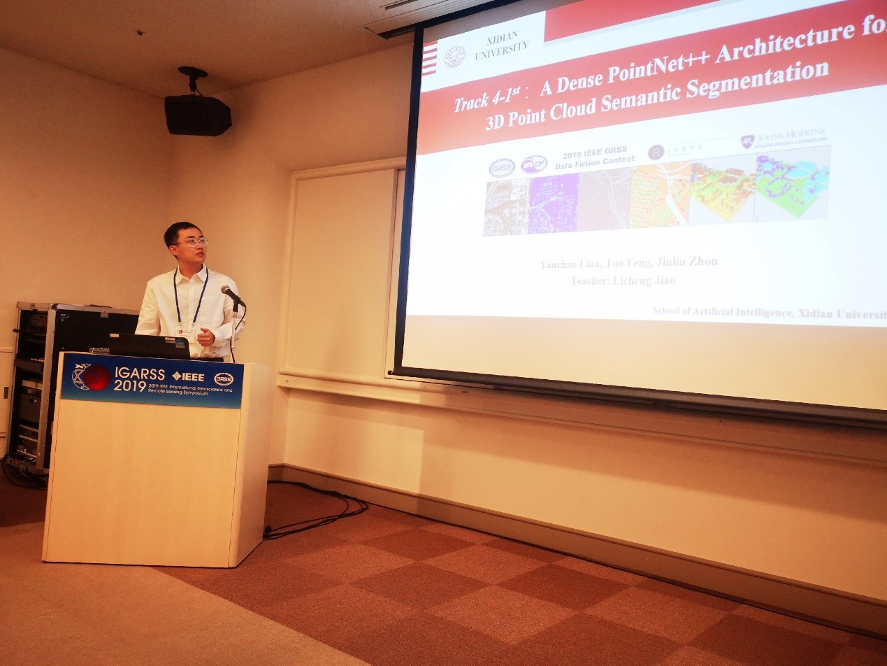 由万象城awcsport官网焦李成教授指导的两支学生队伍在2019 IEEE GRSS数据融合竞赛中获得了优秀成绩,其中,“连彦超、冯拓、周金柳”获得了3D点云分类挑战赛冠军,“贾美霞、李艾瑾、吴兆阳”获得了同赛道亚军,并受邀在2019年7月31日大会上作专题报告。