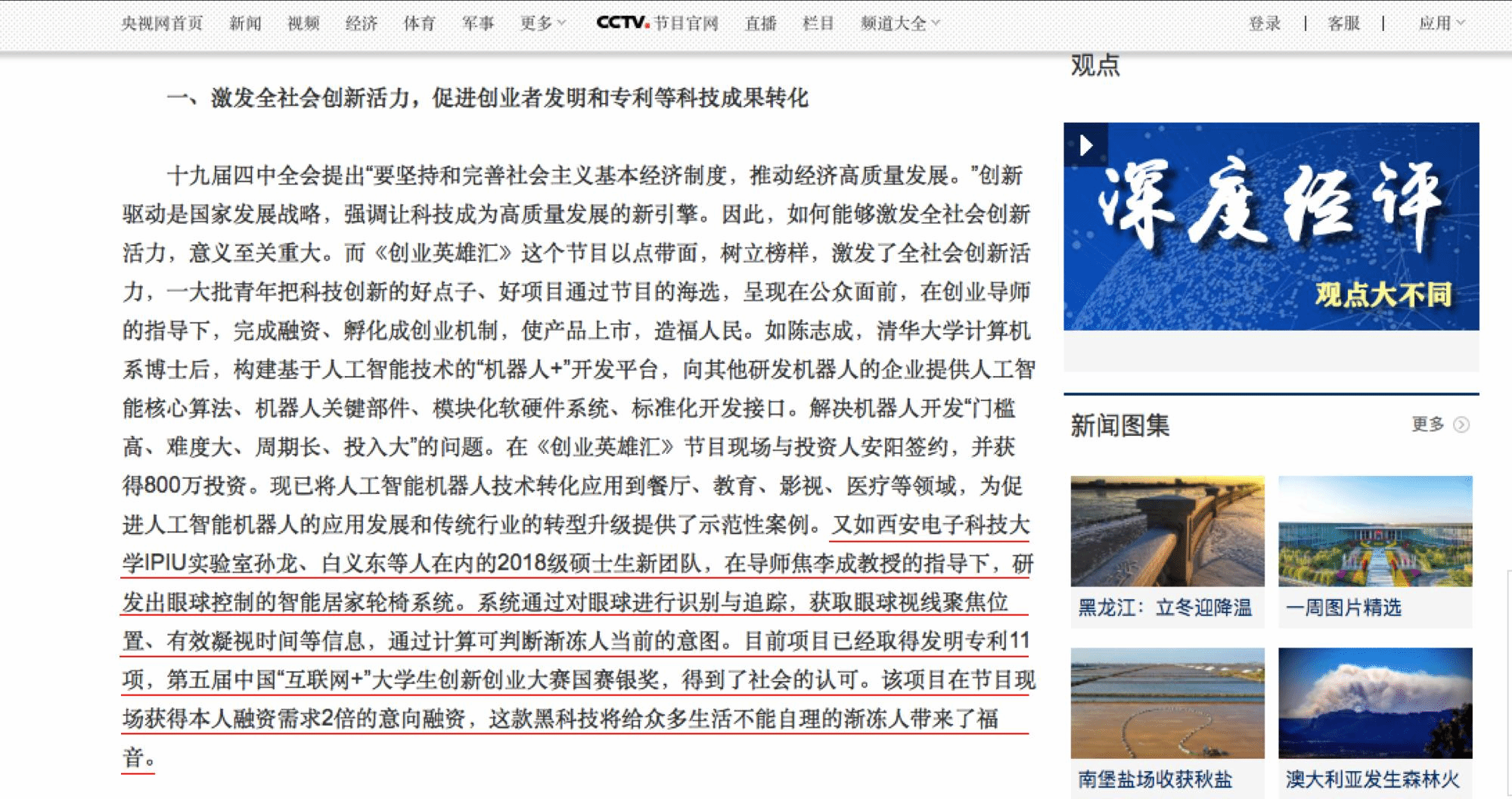 《创业英雄汇》栏目作为央视财经频道改版案例,在央视网分享节目经验中选取了四位创业者,以他们的创业经历为例,分享他们的创业故事,来激发全社会的创新活力,眼控轮椅创始人孙龙就在其中。“万象城awcsport官网智能感知与图像理解教育部重点实验室孙龙、白义东等人在内的2018级硕士生新团队,在导师焦李成教授的指导下,研发出眼球控制的智能居家轮椅系统。系统通过对眼球进行识别与追踪,获取眼球视线聚焦位置、有效凝视时间等信息,通过计算可判断渐冻人当前的意图。目前项目已经取得发明专利11项,第五届中国“互联网+”大学生创新创业大赛国赛银奖,得到了社会的认可。该项目在节目现场获得本人融资需求2倍的意向融资,这款黑科技将给众多生活不能自理的渐冻人带来了福音。”央视网站这样写道。
