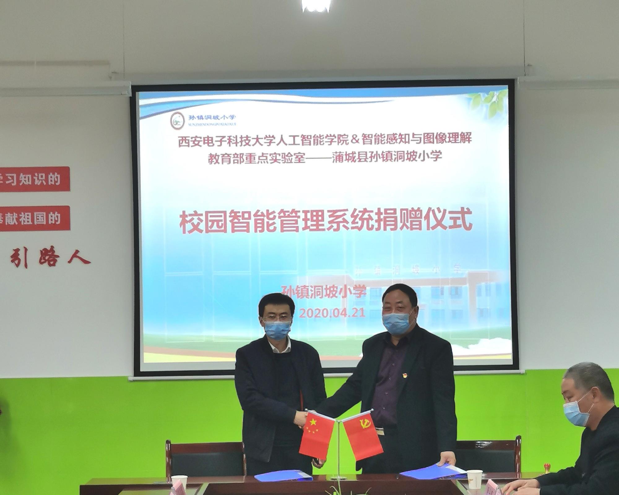 在疫情防控关键阶段、学生全面复学返校之际,西电结合自身专业优势,将研发出的该套校园智能管理系统捐赠给蒲城孙镇洞坡小学,希望通过科技的力量,服务地方做好开学疫情防控以及安全管理工作,用科技为蒲城县孙镇洞坡小学撑起无形的保护伞。