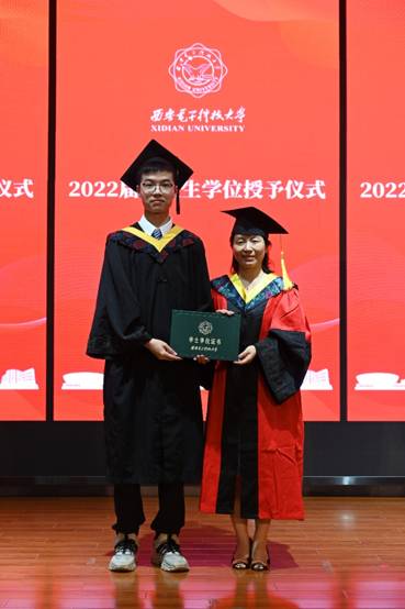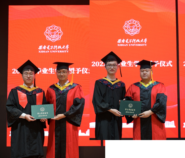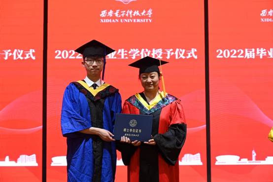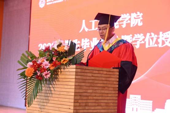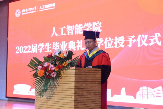 优秀毕业生代表邵奕霖在发言中首先感谢学院的照顾与培养、感谢老师的传道授业解惑,为同学们的学习生活保驾护航、遮风挡雨。他号召毕业生以国家发展、社会进步、人民幸福和人类福祉为先,将勇闯“无人区”,敢做“领头雁”的精神继续传承下去, 在新一代人工智能快速发展中贡献西电智慧。