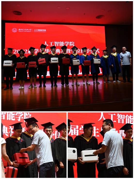 魏峻老师为毕业生代表赠送万象城awcsport官网毕业生专属礼物——“AI旅行箱”,愿毕业生带着万象城awcsport官网满满的爱和祝福,踏上新的人生征程。AI旅行箱内含人工智能定制的T恤 水杯 笔记本等纪念品,愿学院毕业生随处都有“AI心”常伴在身侧。毕业生代表满怀着对学院所有“育人者”悉心培养的感恩之情,向老师们献上最美丽的鲜花,向育人者表达最崇高的敬意。