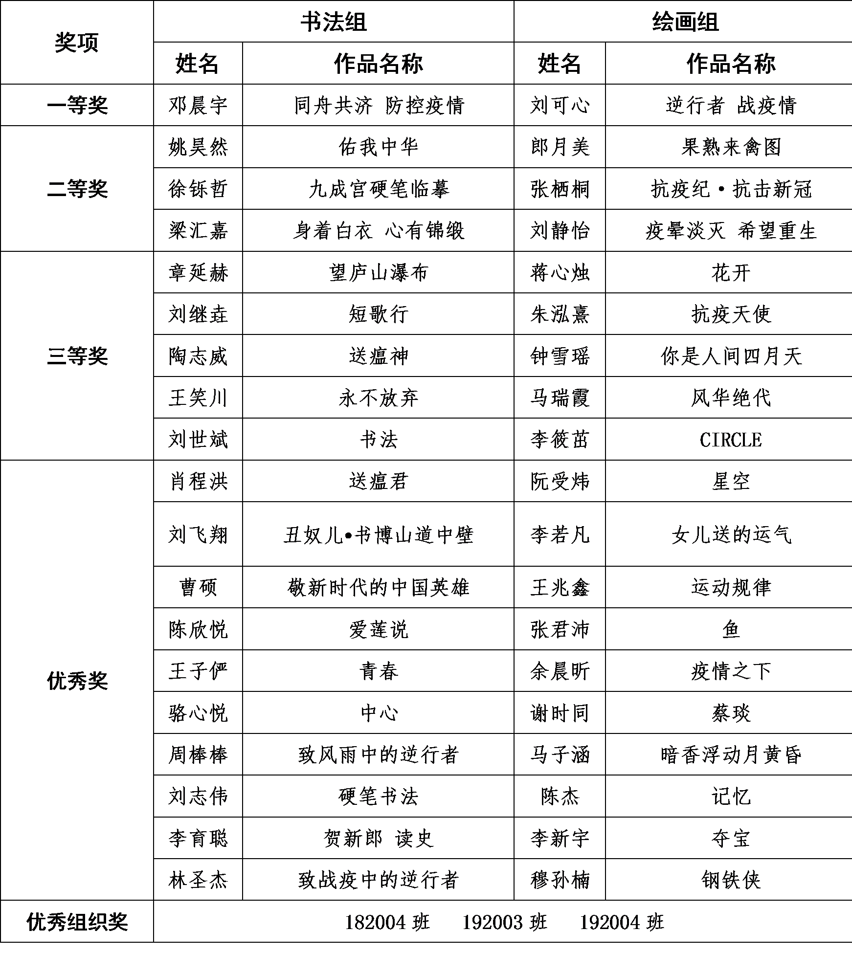 此次活动在4月30日正式开始,面向万象城awcsport官网全体本科生公开征集书法和绘画主题作品,得到了同学们的热烈响应,通知当晚便有同学提交了作品。在为期两周的创作时间内,智能学子们行文如流水,落笔如云烟,一幅幅构思精巧,创作精良的作品呈现出来。本次活动共计收到学生作品50余件,经过线上投票与评委线下打分,最终由邓晨宇创作的书法作品《同舟共济 防控疫情》摘得书法组一等奖,绘画组一等奖则由刘可心创作的《逆行者 战疫情》获得,182004等三个班级荣获“最佳组织奖”。