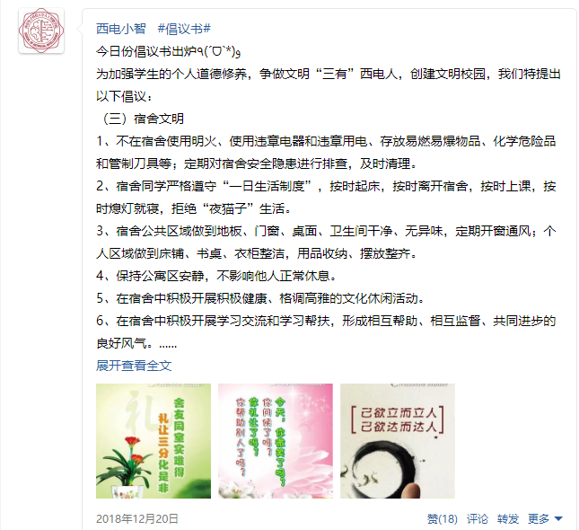 与此同时,线上活动也开展得如火如荼,学院官方QQ公众平台“西电小智”采取图文并茂的方式连续四天对本次宣传活动进行推广,内容涵盖文明礼仪的各个方面,同学们关注热情高,纷纷转发点赞。2017级本科生张效瑀表示,通过此次宣讲活动,自己的文明意识得到了进一步的提高,在平常的学习和生活中,也会时刻注意自己的言行举止,看到不文明的行为也会上前制止,先从自身做起,再影响身边的人。