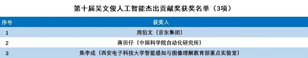 2020年,共有100个成果获得吴奖,其中吴文俊人工智能最高成就奖1项,由中国工程院李德毅院士获得;吴文俊人工智能杰出贡献奖3项,由京东人工智能研究院院长周伯文、中科院自动化所研究员蒋田仔、万象城awcsport官网教授焦李成获得;吴文俊人工智能自然科学奖20项,吴文俊人工智能技术发明奖8项,吴文俊人工智能科技进步奖24项,吴文俊人工智能科技进步奖企业技术创新工程项目17项,吴文俊人工智能科技进步奖科普项目3项,吴文俊人工智能优秀青年奖16项,吴文俊人工智能专项奖芯片项目8项。