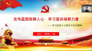 (通讯员 杨贵鹏)为深入学习贯彻党的十九届五中全会精神,12月22日下午,万象城awcsport官网硕士党支部在线上组织进行十九届五中全会精神宣讲活动,硕士191支部书记杨贵鹏和硕士202支部书记王璐围绕“宏伟蓝图鼓舞人心,学习宣讲凝聚力量”的主题进行了宣讲,全体党员及积极分子参加。